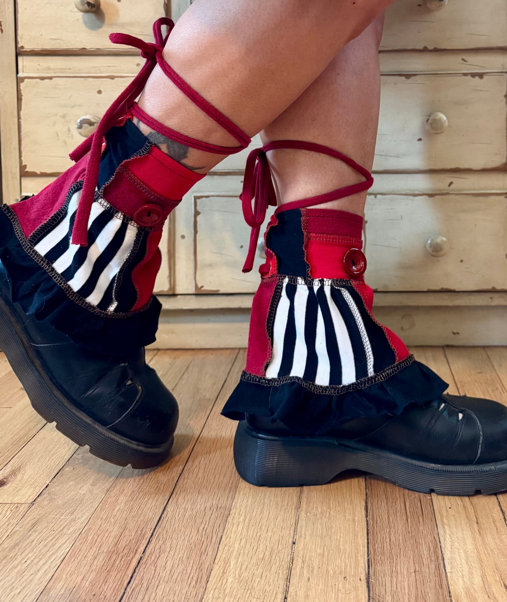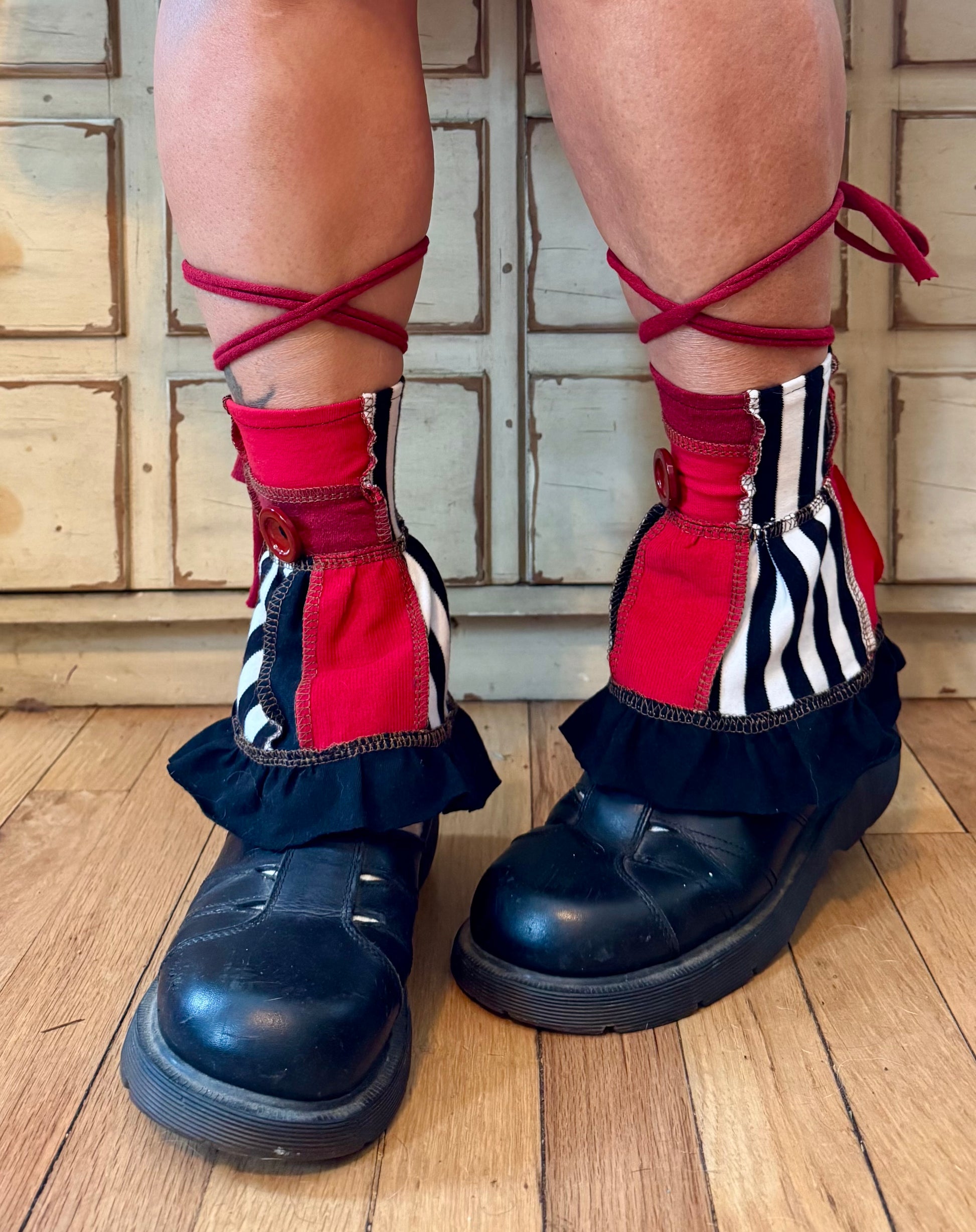 I love layers and ruffles, lace and buttons, I think the little things we adorn ourselves with says alot about our personality. These have been SUCH a fun thing to make tbh I wanted to make 100 more pairs but I figured i'd start with a dozen and see how they're recieved. Let me tell you a little bit more about how I built these. They're all made of stretchy hemp and bamboo with bits of denim and corduroy for the grommet plackets. The grommets are metal and create a channel for lacing up the back and paired with the stretchy hemp it keeps them extra comfy with adjustable sizing and a sturdy closure. The laces are stretchy and long so you can decide how you're gonna tie them. you might wanns wrap them around your legs and tie them in the back, in the front or on the sides. If you prefer them shorter you can clip them to suit your needs. A tiny little joy parade you can add to your wardrobe to ignite spontaneous giggles whenever you feel like it.